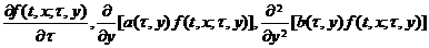 [ Kolmogorov's Second Equation ] If the conditional distribution function   F ( t , x ; τ , y ) of the diffusion process has a distribution density f ( t , x ; τ , y ) , and the following partial derivatives